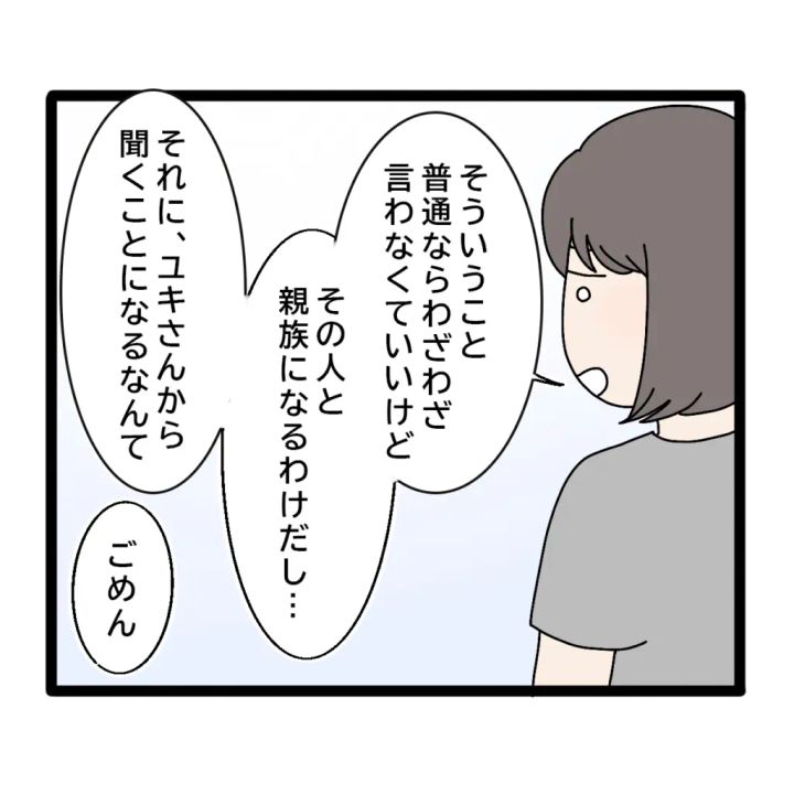 自分の夫の初めての相手が義姉なんて。複雑な気持ちでした。「そういうこと普通ならわざわざ言わなくていいけど、その人と親族になるわけだし・・・それに、ユキさんから聞くことになるなんて。」そうユウトに言ったものの、結婚が決まった時に話して欲しかったのかと言われるとよく分からない気持ちになりました。ユウトは「ごめん」とまた謝りました。