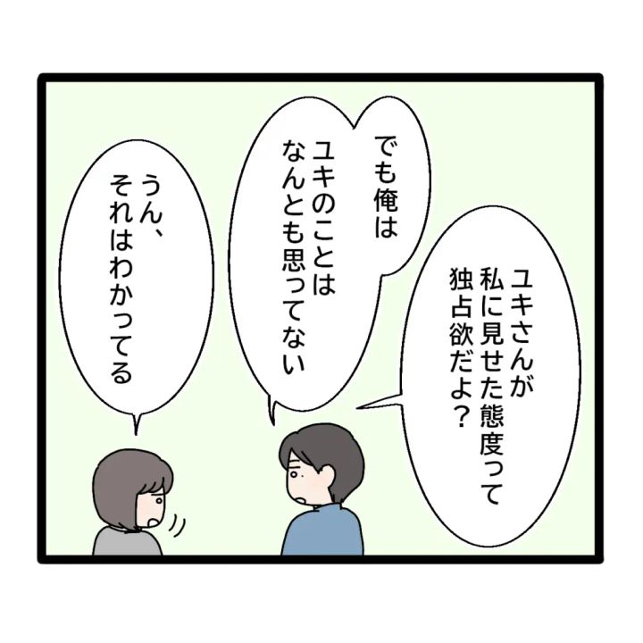 「ユキさんが私に見せた態度って、独占欲だよ?」私はユウトにわかって欲しくて伝えました。「でも俺はユキのことはなんとも思ってない」とユウトはハッキリと私の目を見て言ってくれました。私もそれは分かってる。深く頷いて見せました。