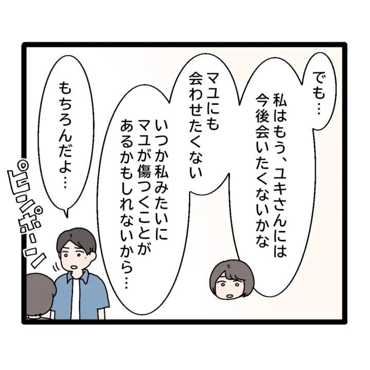 私が、もうユキさんには会いたくない、それに、いつか私みたいにマユが傷つくことがあるかもしれないからマユにも会わせたくないとユウトに伝えると、ユウトは「もちろんだよ」と頷きました。