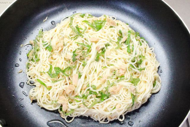 ツナと青じそがまんべんなく行きわたるようにそうめん生地を広げて3分ほど焼き、ひっくり返して反対の面も3分ほど焼くと、両面ともうっすらとした焼き色に。