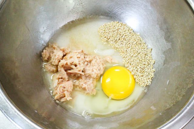 1. 片栗粉と水を混ぜ合わせ、卵、油を切ったツナ、にんにく、ゴマ、塩、こしょうを加えて良く混ぜます。