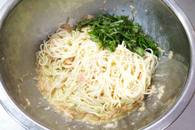 2. 茹でたそうめんを水気を切って加えて混ぜ、千切りにした青じそも加えて良く混ぜます。