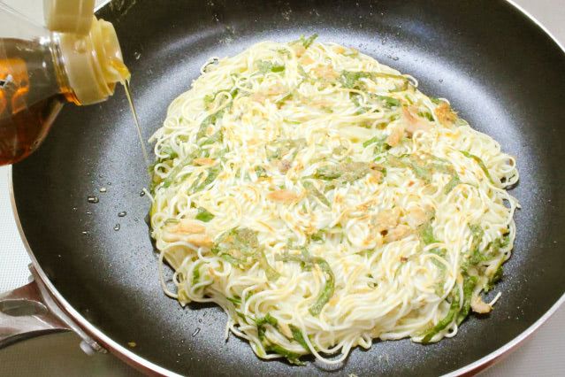 3. 【茹ですぎて残ったら…】片栗粉と卵と混ぜて焼いちゃおう♪「大葉そうめんチヂミ」爆誕!パリッパリなの♡