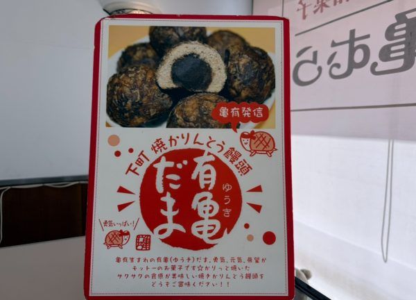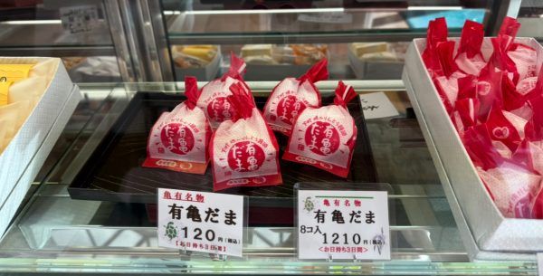 看板商品の一つ有亀だま(ゆうきだま)は、香ばしい皮とたっぷりのあんこが魅力の焼きかりんとう饅頭。