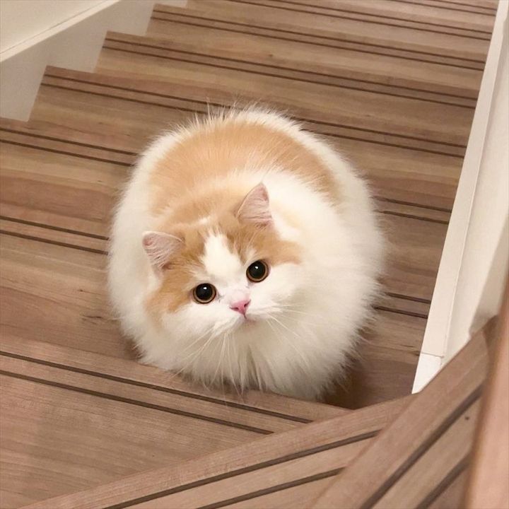 階段で飼い主さんを待ち構えていた時の姿とのことですが、確かに毛の質感やそのまん丸フォルムが毛玉を連想させますね~。 そして、上目遣いしているパッチリしたおめめも、かわいいですね~。