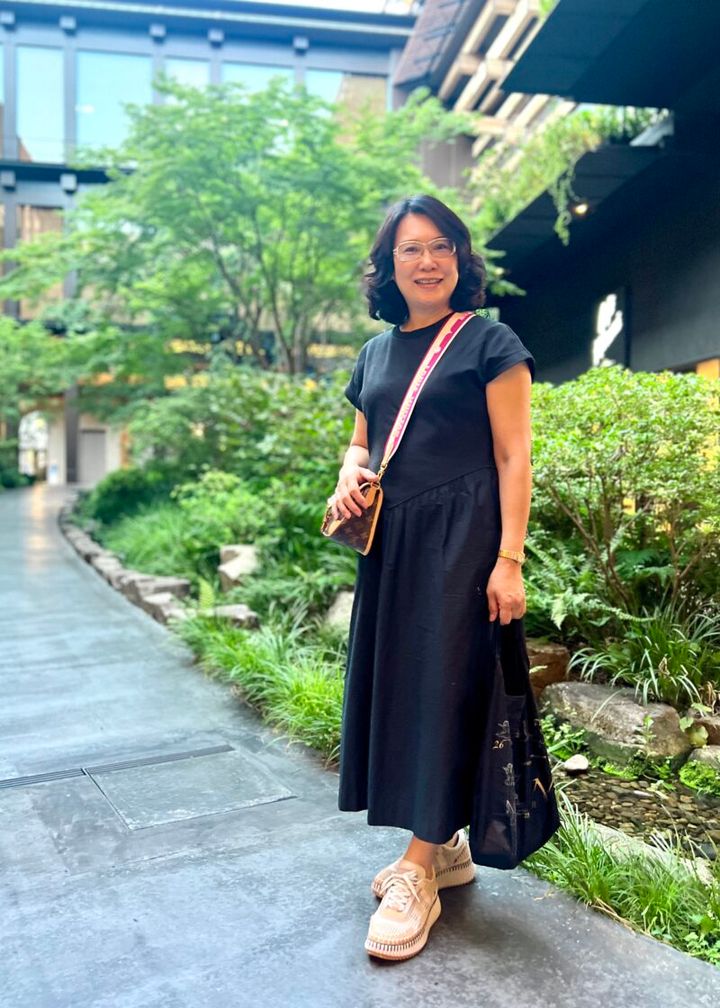 台湾から友達と京都旅行に来ていた陳さん。「エースホテル京都と一体になった、新風館のこの雰囲気がとても好きなんです」。1994年創業の英国発プレミアムコンテンポラリーブランド「オールセインツ」のシンプルなワンピースに、さりげなくハイブラ小物をコーディネート。大人世代の余裕が漂います。