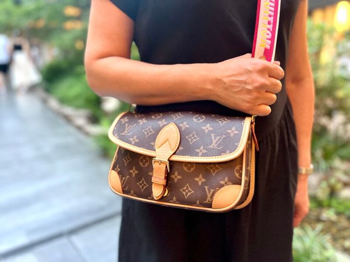 コンパクトながら、スマホ、財布、コスメポーチがしっかり収納できる。旅のお供に最適な機能性バッグは「ルイヴィトン」のディアヌモノグラム。ショルダーストラップを使用して、クロスボディでアクティブでポップなスタイルに。