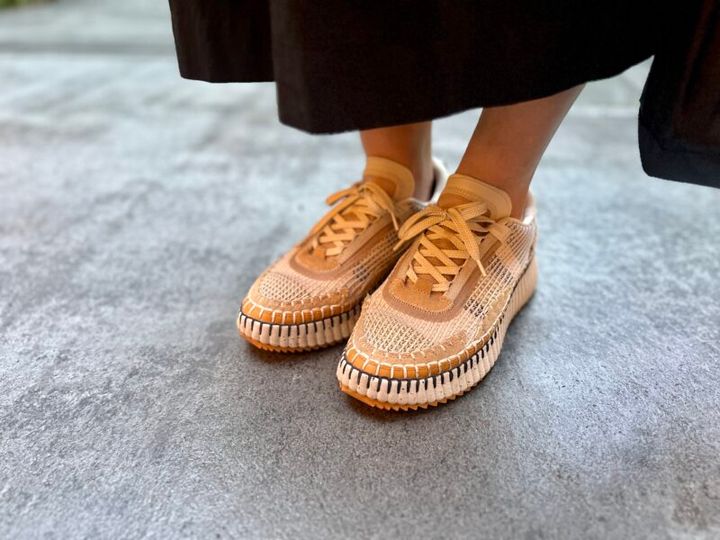 アーシーなカラーとユニークなテクスチャーが目をひく足元は、リサイクル素材を使用したエシカルなスニーカー「クロエ」のナマ。手作業で仕上げられるというブランケットステッチが、リズム感のあるアクセントを添えている。