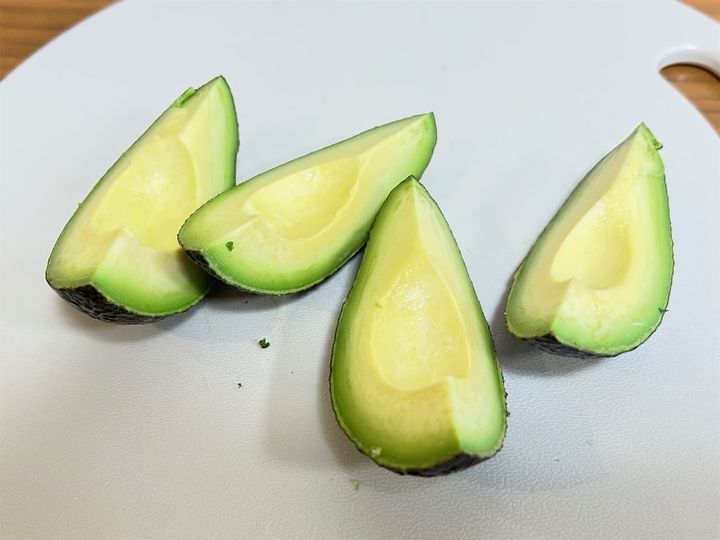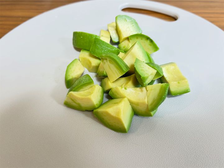 皮を剥いたアボカドを、食べやすいひとくちサイズにカットします。