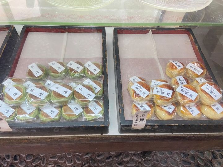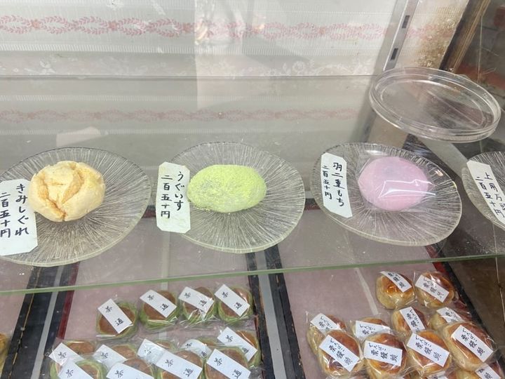 外観から歴史を感じました。店内に一歩入るとガラスのショーケースにどら焼き・饅頭・季節限定のくず桜や水羊羹・きみしぐれ・うぐいす・羽二重餅等、様々な和菓子が並んでいました。どの和菓子も1個250円前後で、お持ち帰りのみの販売です。奥で作業をされている90代の店主の手作りだそうです。