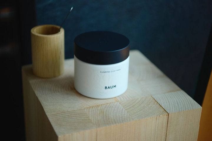 シャワーを浴びた後に、まず迎えてくれるのは、ひのきの香りが心地よいサウナ空間。木のぬくもりに包まれながら汗をかき、外気ラウンジへ移動すると、そこではBAUMの「クリアリング クレイマスク」を体験できる。天然木炭配合のクレイが空気中の微粒子汚れや古い角質を吸着し、洗い流すと明るさに満ちたみずみずしい素肌に出会える。