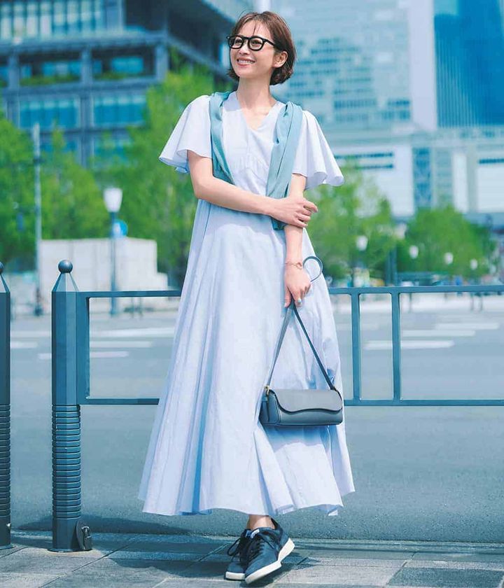 知的なブルーのワンピースには、同系色のスニーカーを合わせて上品&爽やかに。落ち着いた色味の「アシックス」のローカットスニーカーはどんなスタイリングにも合わせやすいので、スポーティ初心者さんにもおすすめです。足元は露出させることで抜け感が出て、涼しげな色っぽさにつながります。