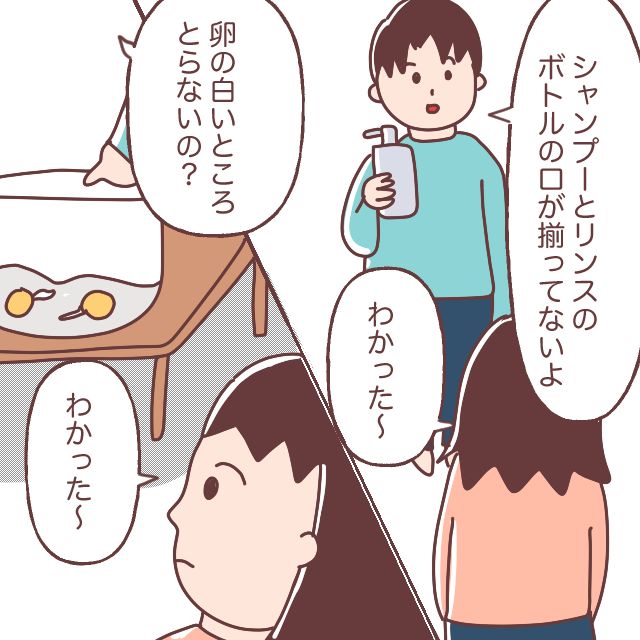 「シャンプーとリンスのボトルの口が揃ってないよ」と言われれば「わかった~」と返事だけ。「卵の白いところとらないの?」と言われても「わかった~」と返事するだけで乗り切ることに。