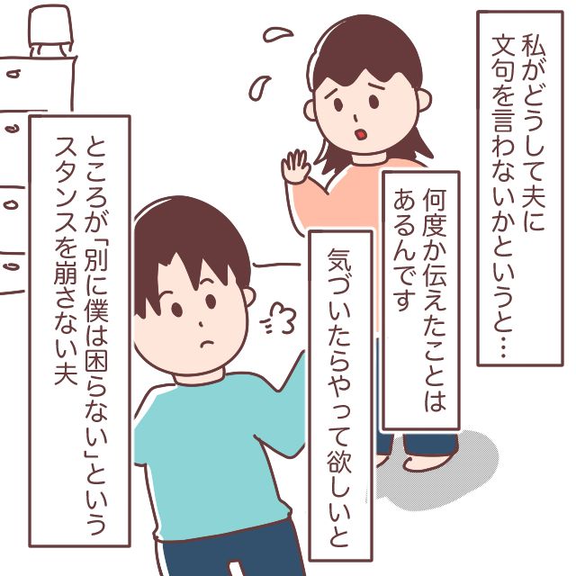 どうして私が夫に文句を言わないかというと・・これまで何度か伝えたことはあるんです。気づいたらやって欲しいと。ところが、「別に僕は困らない」というスタンスを崩さない夫。