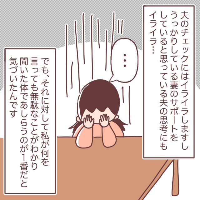 夫のチェックにはイライラするし、うっかりしている妻のサポートをしていると思っている夫の思考にもイライラが止まらない・・でも、それに対して私が何を言っても無駄なことがわかり、聞いた体であしらうのが1番だと気づいたのでした。