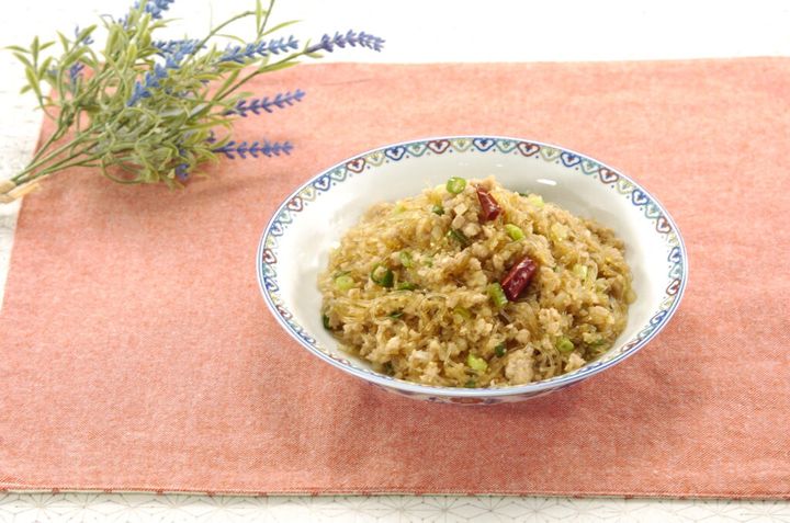 ⑤ フライパンにサラダ油と赤唐辛子を弱火で熱して香りを出し、④を加えて広げ、強火で焼き色をつけてほぐしながら炒め、玉ねぎ、にんにくとしょうがのみじん切りを加えて炒める。