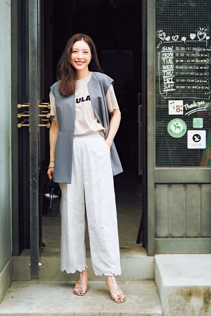ジレでインナーとワイドパンツのトーンを揃え、全体をすとんとしたIラインに。ウエストやヒップ周りもナチュラルにカムフラージュ。ボディのラインを拾わず、華奢見え効果が狙えます。
