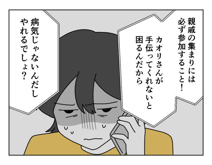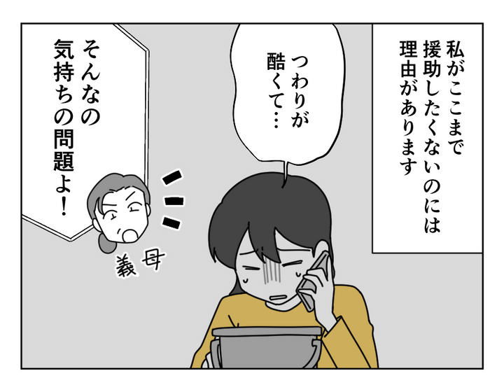 カオリさん(35)は、家族4人で暮らす小学生の男の子2人のママ。現在パート勤めで家計を支え、マイホームのための貯金をがんばっています。しかしある日、義姉から「末期ガンの母(義母)のために月1万円の援助をしてほしい」と連絡が。家庭内の経済状況に加えて義実家との関係を理由に、カオリさんは家計からの援助を拒否。しかし義姉はカオリさんの人格否定をはじめます。カオリさんは、この結論に至った理由を義姉に伝えはじめました。