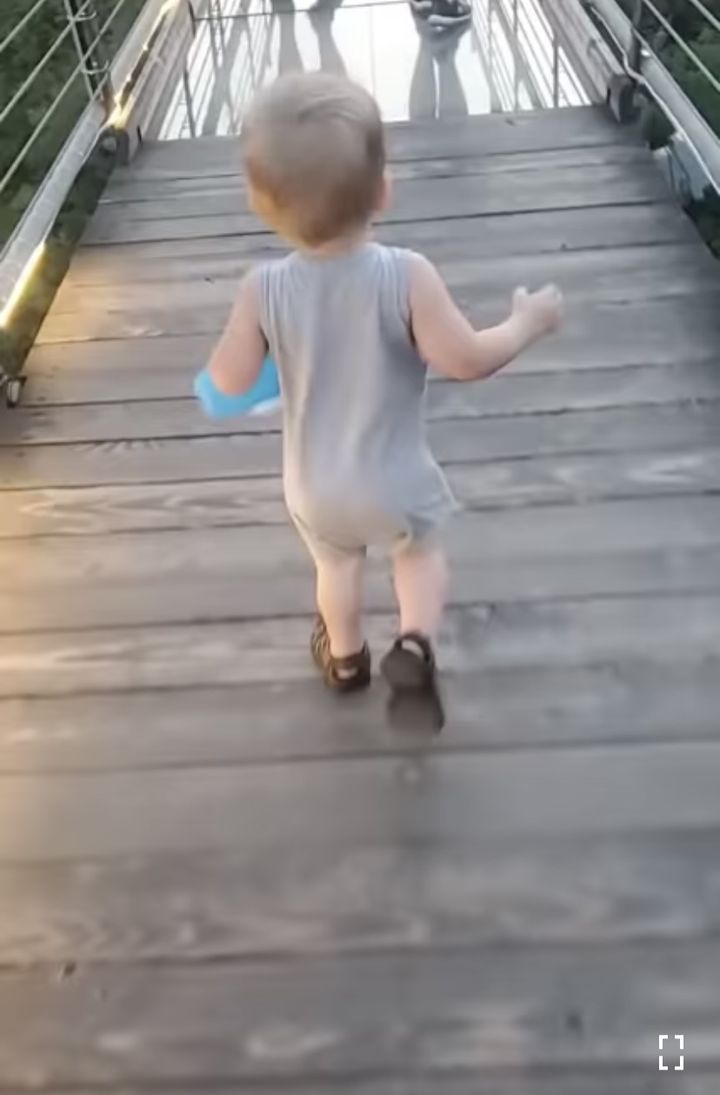 両親と一緒にこのつり橋にやって来た小さな男の子は、木製の通路をテクテクと小走りで進んでいきます。