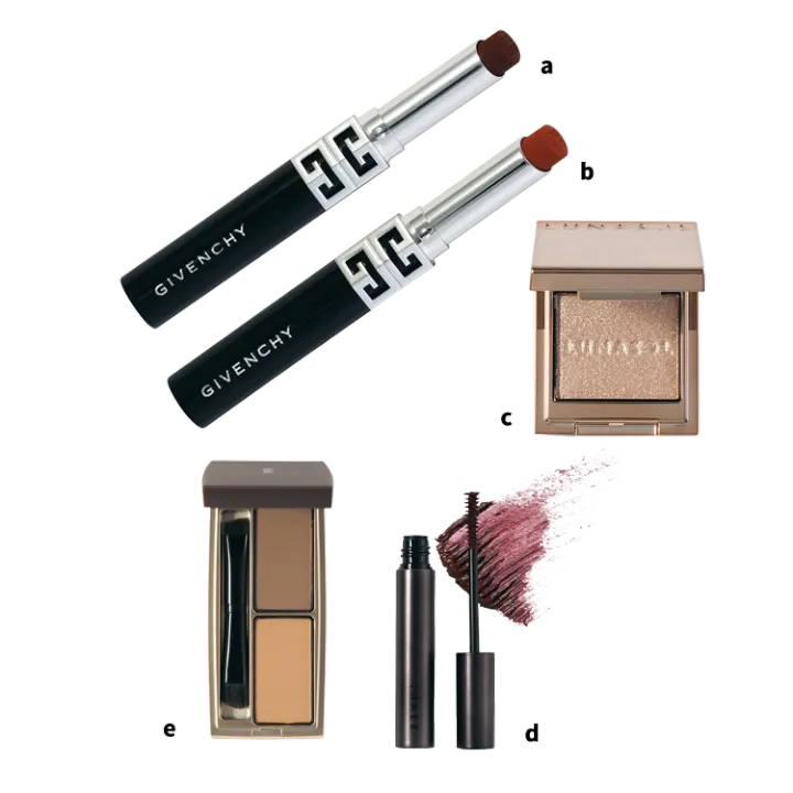 cを上まぶた全体と、下まぶたの目頭~黒目手前の範囲にのせる。dを上下まつ毛にさっとひと塗り。きらめきだけをのせた、抜け感のある目元でリップとのバランスをとって。