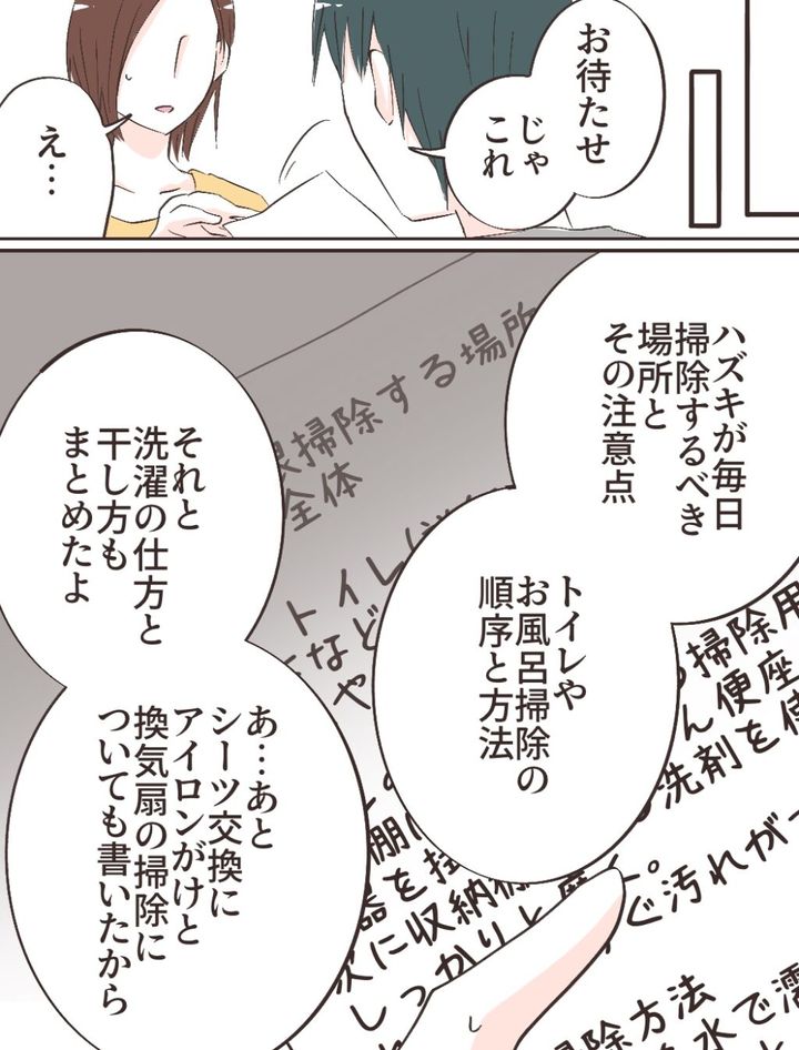 しばらくすると、「お待たせ。じゃ、これ」と言ってリヒトさんが1枚の紙を持ってきました。「え・・」何だろうと思いながら紙を受け取ると、リヒトさんが「ハズキが毎日掃除するべき場所とその注意点。トイレやお風呂掃除の順序と方法。それと、洗濯の仕方と干し方もまとめたよ。あ・・あと、シーツ交換にアイロンがけと換気扇の掃除についても書いたから」と言いました。紙には掃除についてのことがびっしり書いてありました。