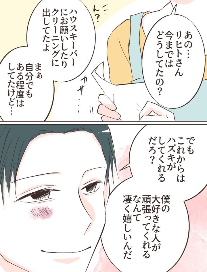 あまりにたくさんのことを求めるリヒトさんに、私は「あの・・リヒトさん今まではどうしてたの?」と聞いてみました。すると、リヒトさんは「ん?ハウスキーパーにお願いしたりクリーニングに出してたよ。まぁ自分でもある程度はしてたけど・・」とさらり。そして「でも、これからはハズキがしてくれるだろ?僕の大好きな人が頑張ってくれるなんてすごく嬉しいんだ」と目を細めました。