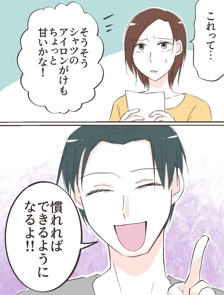 仕事から帰ってきたリヒトさんは、掃除が行き届いていないところが気になって仕方がない様子。ハズキさんがご飯を準備してくれていますが、やることリストを作ると言って部屋を出ていってしまいました。しばらくすると、掃除するべき場所や掃除方法などがびっしりと書かれた紙を持って戻って来たリヒトさん。紙を渡され戸惑うハズキさんに「シャツのアイロンがけもちょっと甘いかな!」とダメ出しをすると「慣れればできるようになるよ!」とお決まりのセリフ。これまではハウスキーパーやクリーニングに外注していたという家事のクオリティを当然のようにハズキさんに求めるリヒトさんは、「大丈夫!ハズキならすぐできるようになるよ!!」と力強く言うのでした。
