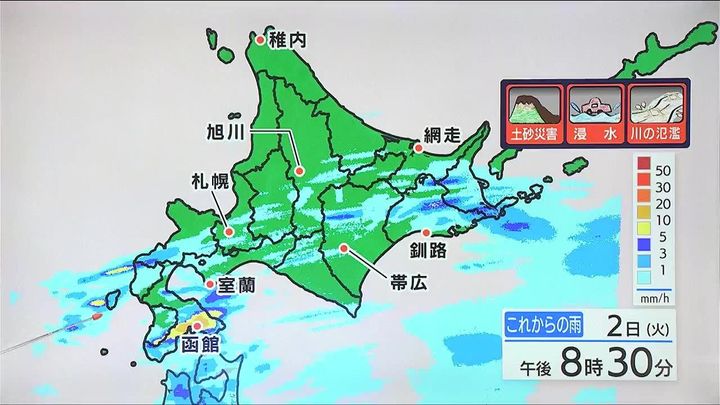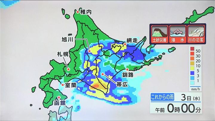 日高地方や道東ではあす3日(水)早朝にかけて激しい雨の降るおそれがあります。あす3日(水)朝は広く雨がやむ見込みですが、増水した川などには近づかないで下さい。