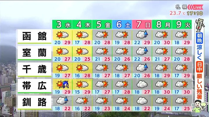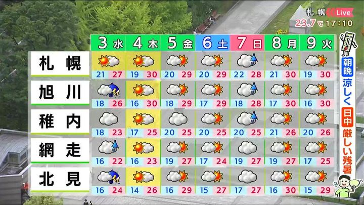 木曜日からは晴れる日が多いでしょう。朝晩は涼しくなりますが、日中は残暑が厳しく、札幌や旭川では木曜と来週は30度の真夏日予想です。9月も気温は平年より高く経過するでしょう。