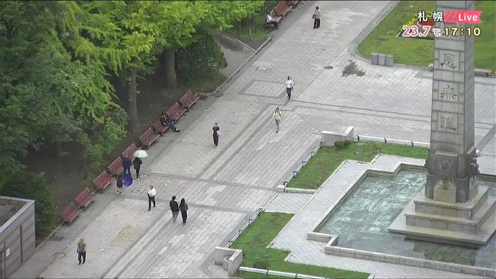 札幌の大通公園では傘をさしている人も、ベンチで座っている人もいます。