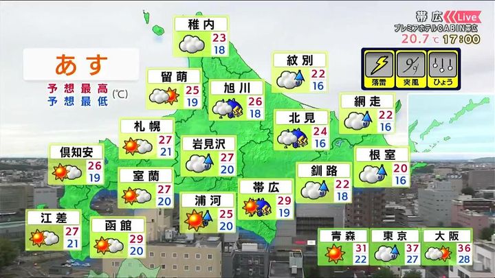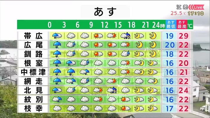 朝まで広く雨で、降り方の強まるところがあるでしょう。午後も急に雨雲がわき立ち、帯広や北見など内陸で雷雨となるでしょう。帯広は29度と暑いですが、その他は22度くらいです。