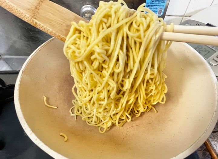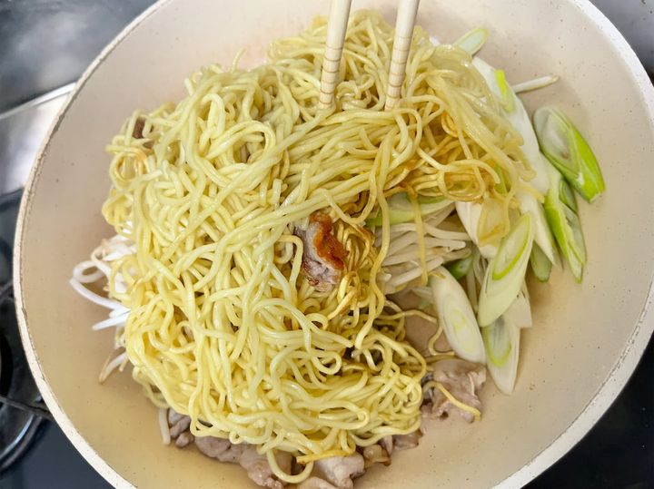 5.茹でた麺を加え、強めの中火で焼く。菜箸とヘラを使って、麺を持ち上げながら水分をしっかり飛ばす。
