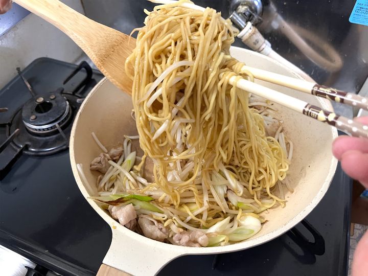 3. 【お家焼きそばの究極系】袋麺が驚異のもっちもちに♡菜箸とヘラで麺の水分を飛ばすワザを習得せよ!