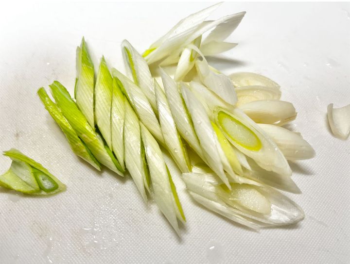 1.豚肉を3cm幅にカット、長ねぎは太めの斜め切りにする。あれば、細い青ねぎを小口切りにしておく。