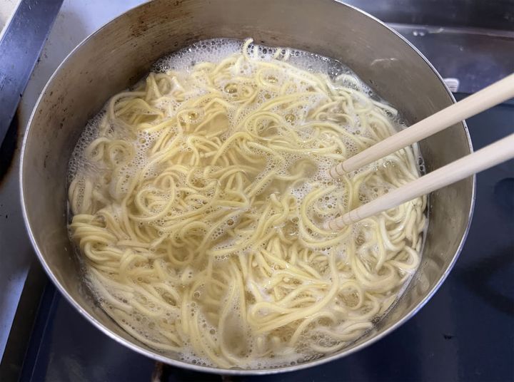 3.鍋にお湯を沸かし、生麺をかために茹でる。