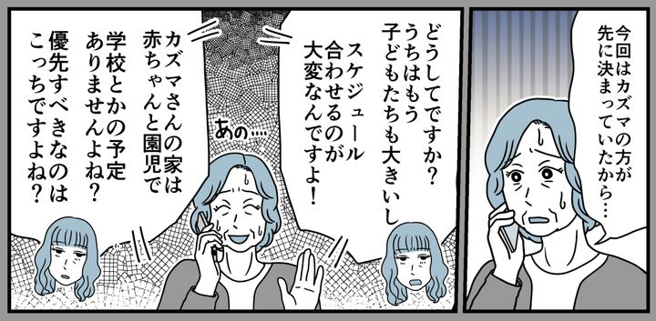 義兄はわが家の予定を変えさせようとしてきました。義母が「先に決まっていたから」と断ると、今度はリエさんが猛クレームをつけてきたのです。「赤ちゃんと園児なんだからどうにでもなりますよね?」「優先すべきなのはこっちですよね?」