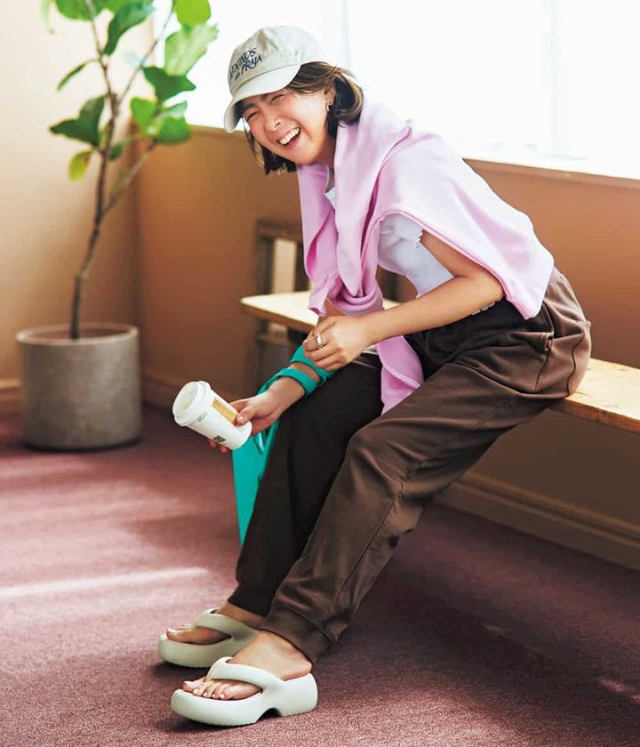 ご近所でもスタイルアップと今どき感を両立できるボリュームトングサンダル。サンダル¥17,600(メリッサ/メリッサ シューズ ジャパン)Tシャツ¥2,420(ヘインズ/ヘインズブランズ ジャパン カスタマーセンター)肩に巻いたスウェット¥4,048パンツ¥5,445マルシェバッグ¥2,310(すべてユナイテッドアスレ/キャブ)キャップ¥8,250(ザ シンゾーン/シンゾーン ルミネ有楽町店)ピアス、リング/本人私物