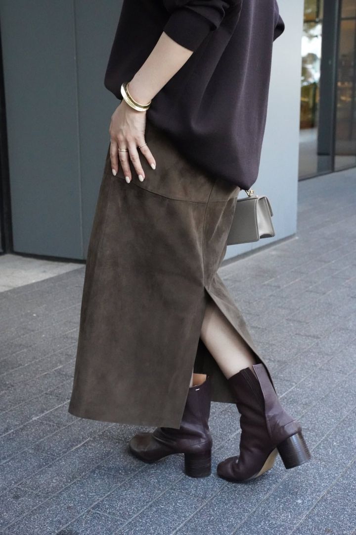 「ニュアンス違いのブラウンでまとめたワンカラーコーデ。オフショルダーニットとスエードスカートといった異素材MIXでスタイリングに奥行きとヌケ感をプラスし、マルジェラのブーツを合わせることで上品に仕上げました」