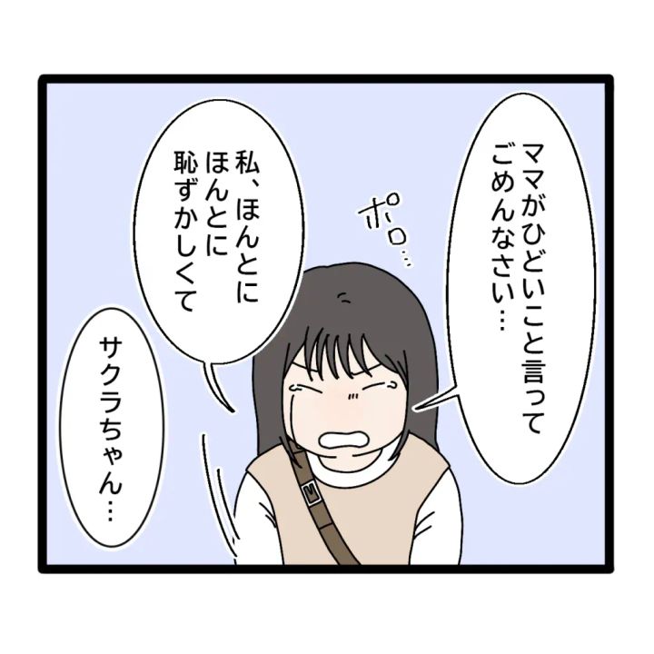 「ママがひどいこと言ってごめんなさい」と涙をこぼして言いました。「私、ほんとにほんとに恥ずかしくて。」そう言ってサクラちゃんは頭を下げました。