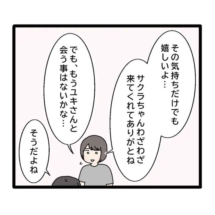 「その気持ちだけでも嬉しいよ・・・」素直な高校生のサクラちゃんに、私は伝えました。「サクラちゃん、わざわざ来てくれてありがとね。でも、もうユキさんと会うことは無いかな。」ユキさんへの気持ちは変わらない私は、もう会うつもりがありません。サクラちゃんも「そうだよね」と納得している様子です。