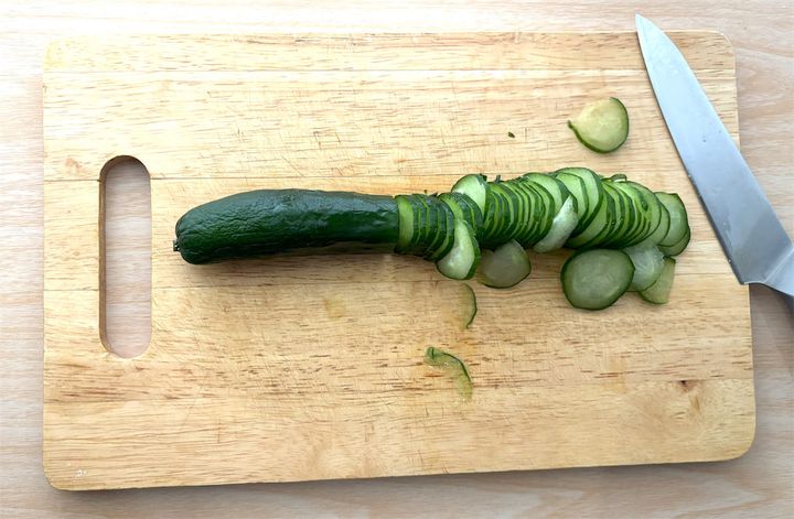 半解凍した1本そのままのきゅうりは、下の画像のように薄く小口切りでスライスします。
