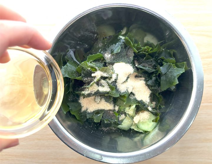 水気を絞った冷凍きゅうりとわかめをボウルに入れ、そこへ砂糖、酢、しょうゆを加えます。