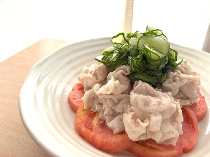 皿に、1のトマトを乗せて、その上に2の豚肉を盛り付け、最後に冷凍きゅうりを乗せたら完成です。