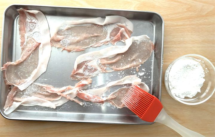 豚薄切り肉は広げて、はけなどを使って軽くはくように片栗粉を塗ります。