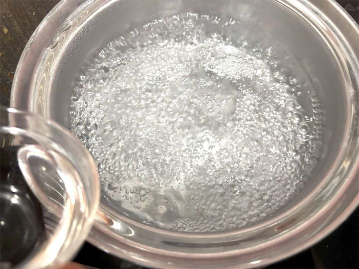 鍋に水(分量外、1L程度)と塩を入れてから火にかけて沸騰させ、沸いたら火を少し弱めて酒を加えます。