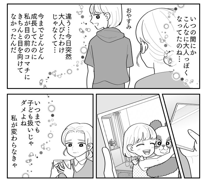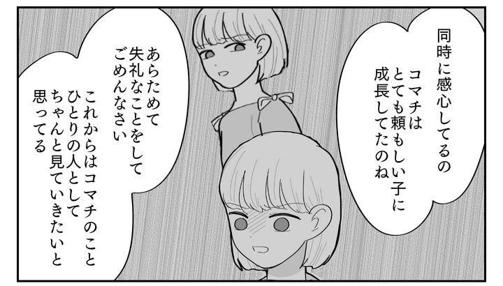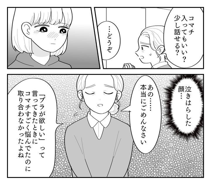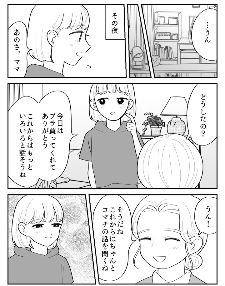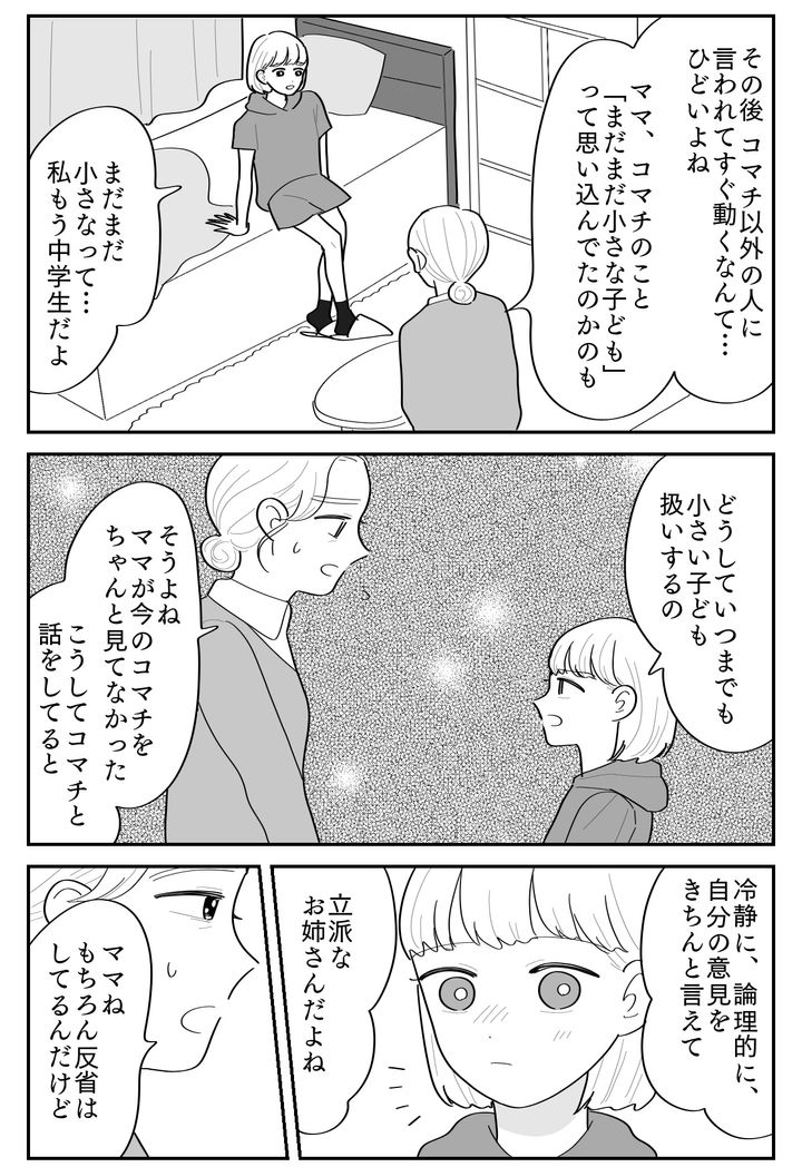 コマチに「ブラが欲しい」と泣きながら訴えられたとき、私はコマチの気持ちをちゃんと聞こうともせずに茶化すような対応をしてしまいました。そしてルカちゃんのお母さんに言われたとたん、あっさり態度を変えて買い与えて……。コマチが自分のことをないがしろにされ、バカにされたように感じても仕方ありません。