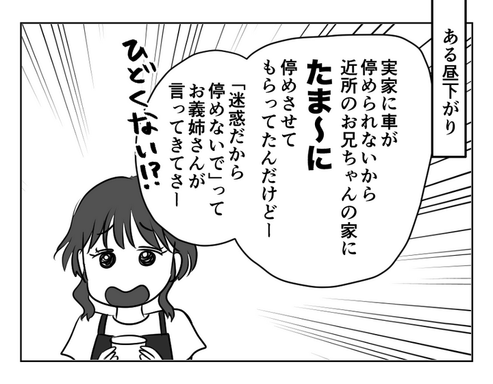 エマさんは毎週日曜になると、実家に帰っています。しかし実家の駐車場は狭くて停めにくい……そこで実家から徒歩5分の、兄・カズトシさんの家に停めていました。毎週日曜日に停めていたところ、兄嫁のヒカリさんに「迷惑なのでもう停めないで」と言われてしまい、ちょっとピンチのエマさんです。