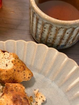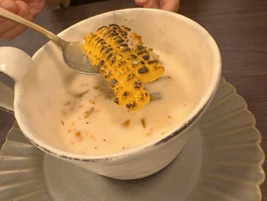 コーンポタージュ:下にポタージュが沈んでいて、まずは上澄みのスープをいただき、次に沈んでいるポタージュを頂き、最後にまぜていただく、という味変が楽しめました。焼きとうもろこしがごろっと入っていて、ボリューミー!1杯飲むのに時間かかりました。とてもおいしかったです。こんなポタージュ初めて!