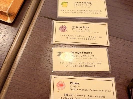 レモンサワーサップ(柑橘とトロピカルフルーツの爽やかブレンド)、プリンセスローズ(ピーチアプリコットとローズブレンド)、オランジェサンライズ(トロピカルアイスティーをイメージ)、パルシー(ローズヒップにハイビスカスをブレンド) どれも、香り高く、と~ってもおいしかったです!