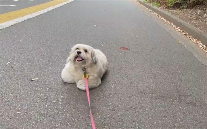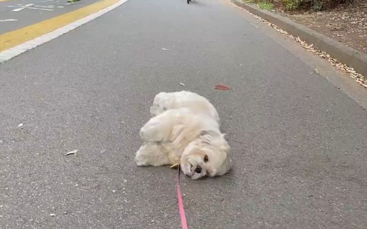 歩くのを拒むように道の真ん中でゴロリと倒れ込んだ愛犬。 おさんぽをボイコットするその姿が話題になっています!
